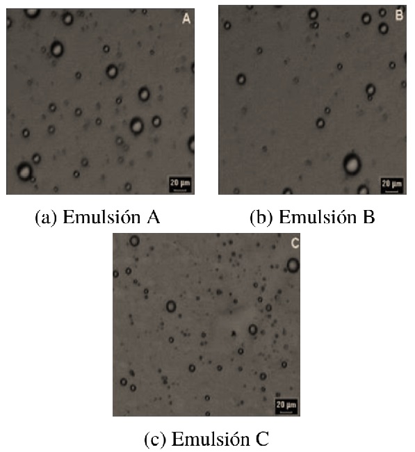 La Figura 7 muestra una imagen de las tres emulsiones donde se observa claramente círculos de diferentes diámetros correspondientes a las gotas de agua como fase dispersa en el medio continuo. Se observa una distribución de tamaños de gota en las tres emulsiones. De acuerdo a la micromarca, se aprecia que el diámetro de las gotas es menor a 20 µm. Se observa que el tamaño de las gotas se mantiene constante en las muestras estudiadas, ya que las variaciones encontradas están en ± 1 µm. Las micrografías indican emulsiones normales del tipo agua en aceite (W/O). Se observa ausencia de floculación y de emulsiones múltiples.