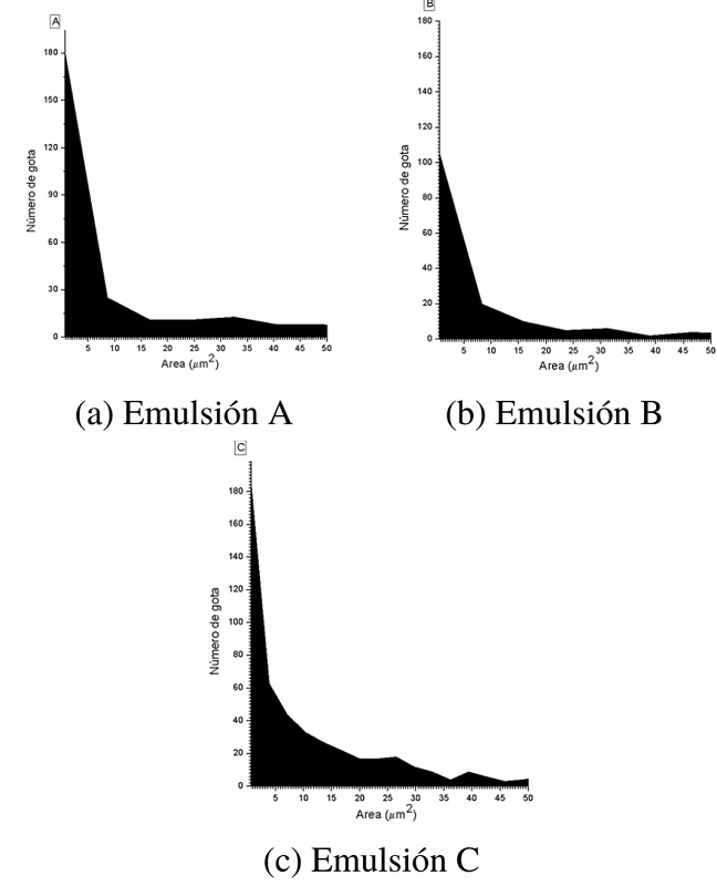 En la Figura 8 se muestran las distribuciones log-normal del número de gotas en función del área de cada gota. El ancho a media altura de las distribuciones equivale al área promedio de las gotas correspondientes a cada emulsión, con este valor se calculó el diámetro promedio de las gotas. En la Tabla 4 se reportan los valores del área y diámetro promedio, confirmando lo observado en la Figura 7.