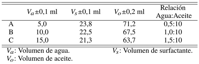 Emulsiones. Se sintetizaron tres emulsiones con proporciones distintas de agua;aceite. La muestra A tiene una proporción agua:aceite de 0,5:10. La muestra B, una proporción de 1,0:10 y la muestra C, una proporción de 1,5:10 como se muestra en la Tabla 1, donde también se exponen los volúmenes de agua, aceite empleados.