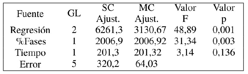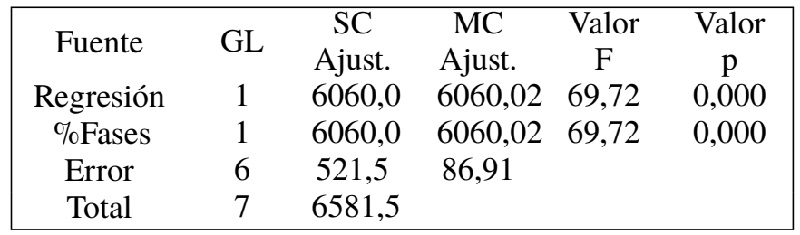 En función a los resultados, se aplicó un nuevo diseño con la tenacidad de impacto como variable respuesta y una variable independiente que es el porcentaje de fases intermetálicas, resultando ser significativa y presenta una relación lineal con respecto a la variable respuesta. En análisis de varianza realizado en el programa Minitab, resultó lo siguiente: