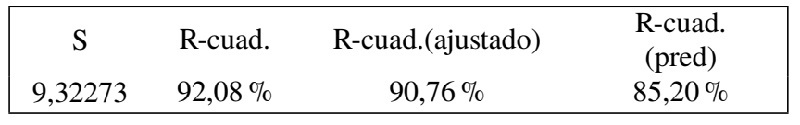 El modelo presenta un R2 de predicción en 85,20 %, siendo éste por encima de lo aceptable, indicando que este modelo (ecuación (1)) presenta una alta probabilidad de predicción