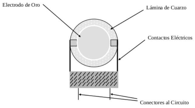 Microbalanzas de cuarzo. Son dispositivos en los que el efecto piezoeléctrico se usa como herramienta para detectar cambios muy pequeños de masa. La frecuencia de resonancia del cristal depende de la masa total resonante. La variación de la frecuencia es proporcional a la cantidad de masa añadida y el sensor tipo microbalanza opera como una balanza sensible. Por otro lado, la microbalanza tiene incorporado un circuito oscilador donde la frecuencia de oscilación va disminuyendo conforme se va acumulando masa sobre la superficie del diseño [18]. Estos dispositivos están formados por una delgada lámina circular de cristal piezoeléctrico, en la que se han depositado por ambas caras recubrimientos metálicos que actúan a manera de electrodo. El oro es el recubrimiento más ampliamente utilizado. En la Figura 2, se muestra el esquema del diseño típico de una microbalanza de cuarzo [10].