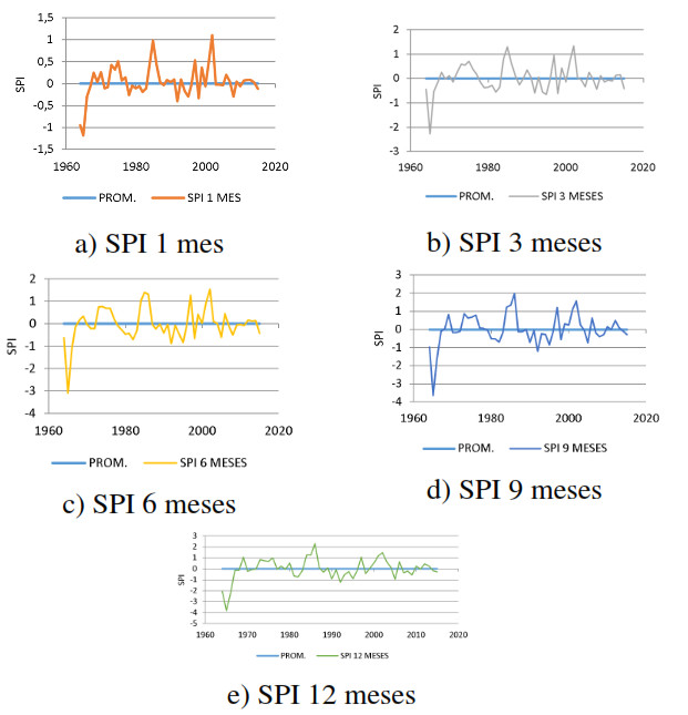 Para realizar el análisis del índice de precipitación estandarizada, se analizaron la suma de precipitaciones anuales desde 1957 hasta 2015, que hace un total de 58 años de datos; tomando como sequías de la serie de datos analizados los que se ubican por debajo del promedio de la serie original (0).