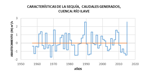 Después de un análisis de las series históricas de caudales totales anuales del río Ilave, primeramente, la serie se homogeneizó y estandarizó, dando como resultado nuevas series de datos asociados como run negativo y run positivo; en este trabajo nos interesa analizar los runes negativos, que son los asociados a las sequías. Se analizó la serie histórica desde 1957 hasta el 2015, donde se ha podido apreciar seis eventos de sequías con características diferentes (Tabla 6), lo que se refleja en la Figura 2.