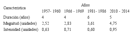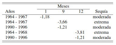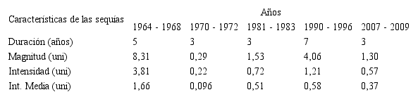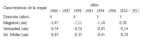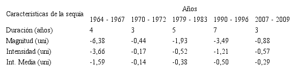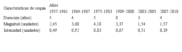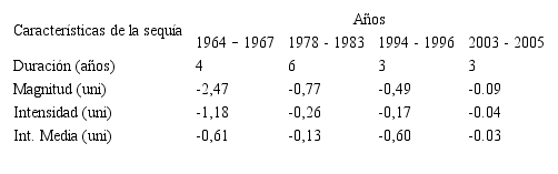 Según lo indicado, un período de sequía se establece cuando el SPI presenta una secuencia continua de valores negativos tales que estos sean iguales o menores a –1, si bien se considera que este evento no llega a su fin hasta el momento en que dicho índice vuelva a tomar su valor positivo. Esta definición permite caracterizar cada período seco de acuerdo a su duración, intensidad y magnitud. La duración del evento lo determina la longitud del período, en el que los valores del SPI cumplen las condiciones requeridas por dicha definición. La intensidad del mismo viene determinada, de la precipitación, por el máximo valor negativo a partir de -1, que el SPI alcance dentro del período seco analizado; finalmente, su magnitud, viene dada por la suma de los valores del SPI correspondientes a todos los meses comprendidos dentro del período seco considerado.