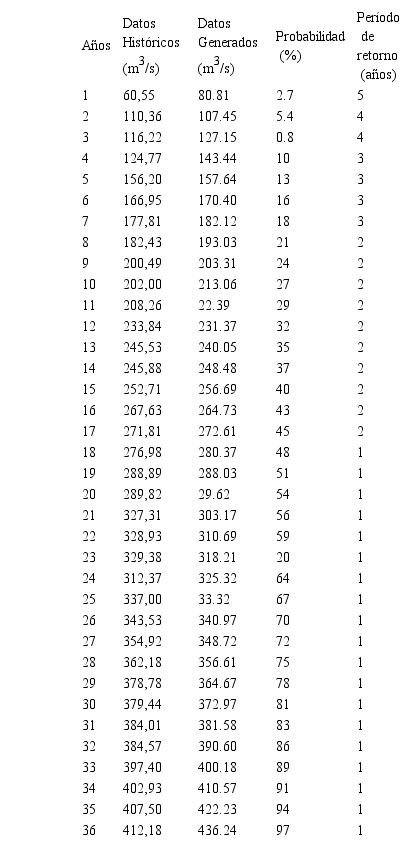 La aplicación del modelo, según la ecuación (5), permite generar series de descargas anuales, siendo necesario utilizar parámetros de la serie de datos históricos: media y desviación estándar y valores de la variable estocástica independiente: números aleatorios normales (0,1)