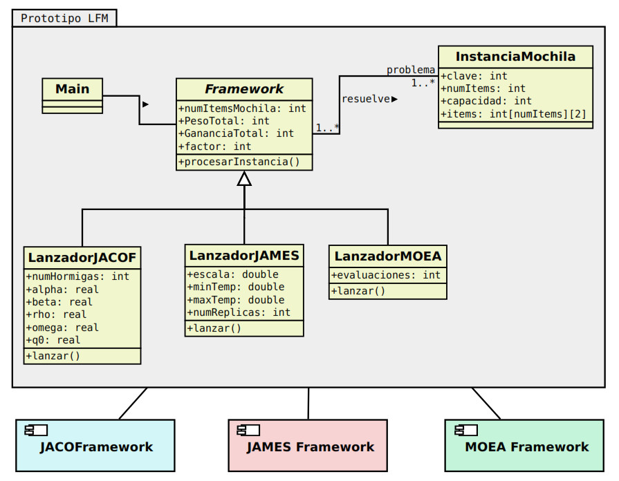 La clase Main utiliza la clase genérica Framework para ejecutar las metaheurísticas seleccionadas por el usuario. A su vez, la clase Framework utiliza la clase InstanciaMochila para resolver una instancia particular del KP 0-1. Las clases LanzadorJACOF, LanzadorJAMES y LanzadorMOEA invocan los algoritmos de los frameworks JACOF, JAMES y MOEA, respectivamente.