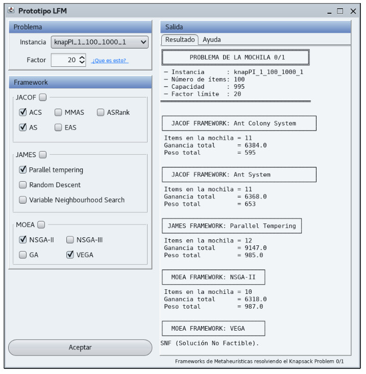 El prototipo LFM (“Lanzador de Frameworks de Metaheurísticas”) fue desarrollado bajo la plataforma Java (Open JDK 7) usando exclusivamente bibliotecas de licencia libre. El prototipo resuelve el KP 0-1 utilizando los algoritmos mencionados de cada uno los tres frameworks.