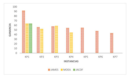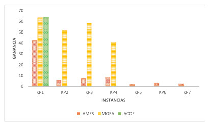 En la Figura 3 se muestra el gráfico con las mejores soluciones para el KP 0-1 obtenidas por el mejor algoritmo de cada framework, derivado de las 30 ejecuciones por instancia. En general, JAMES obtiene los mejores resultados. Aunque MOEA supera a JAMES en la instancia KP3, éste no encuentra soluciones a partir de la instancia KP5. En el caso de JACOF, solo encuentra solución para la primera instancia del problema con el mismo resultado que MOEA.