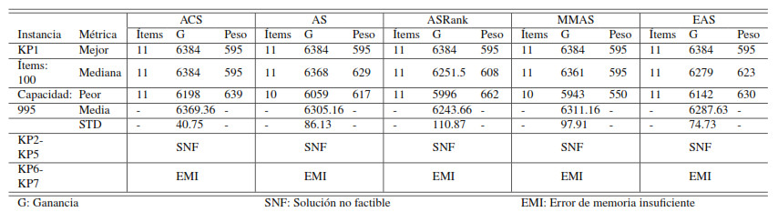 En la Tabla 1 se muestran los resultados obtenidos por las 5 variantes de OCH incluídas en JACOF, en las 7 instancias del problema. Como se puede observar, los 5 algoritmos basados en colonia de hormigas únicamente resuelven la instancia más sencilla del problema, el KP1. En cuanto a las instancias KP6 y KP7, consideradas las más difíciles, los 5 algoritmos lanzan una OutOfMemoryException, que ocurre cuando la máquina virtual de Java carece de la memoria suficiente para instanciar nuevos objetos. Cabe mencionar que no se realizó ninguna configuración adicional para ejecutar el Prototipo, se utilizó la memoria que utiliza de manera predeterminada la máquina virtual de Java.
