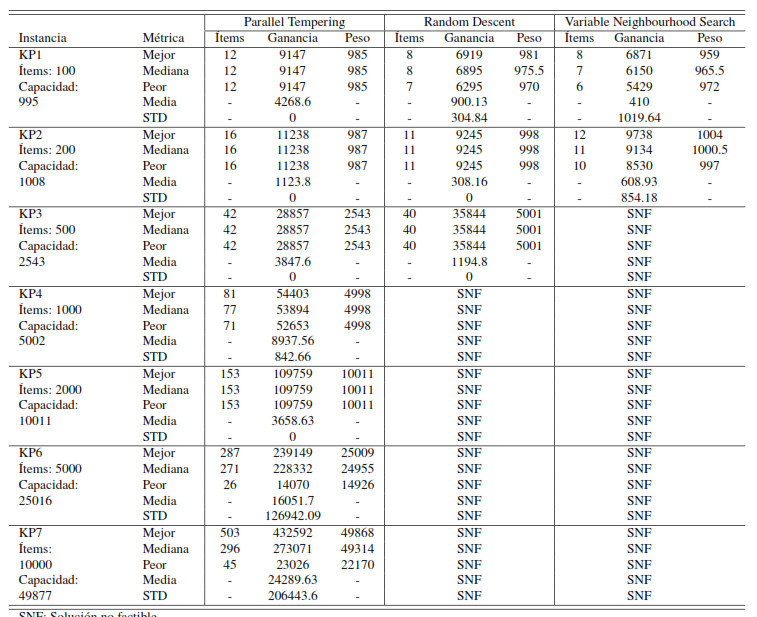 En este artículo se utiliza un conjunto de instancias disponibles en línea como instances_01_KP (adaptadas de David Pisinger’s problems) [20]. Estas instancias son usadas como benchmark para comparar el desempeño de diferentes algoritmos. El conjunto consiste de 21 instancias con diferente cantidad de ítems, de los cuales se seleccionó un subconjunto de 7 instancias que pueden considerarse representativo del total.