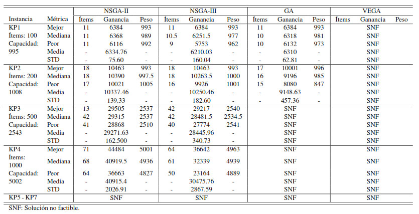 Las Tablas 1, 2, y 3 muestran los resultados obtenidos por los algoritmos de cada framework en las 7 instancias del problema de la mochila. La Tabla 4, muestra los resultados del mejor algoritmo de cada framework en cada una de las 7 instancias. El formato de las cuatro tablas es el mismo: en la primera columna se muestran las características de cada instancia (número de ítems y capacidad), la segunda columna contiene las métricas utilizadas (mejor solución, peor, media, mediana y desviación estándar), y finalmente se muestra el número de ítems en la mochila, la ganancia y el peso, por cada algoritmo. Los algoritmos se muestran ordenados de izquierda a derecha de acuerdo a la mejor solución obtenida.