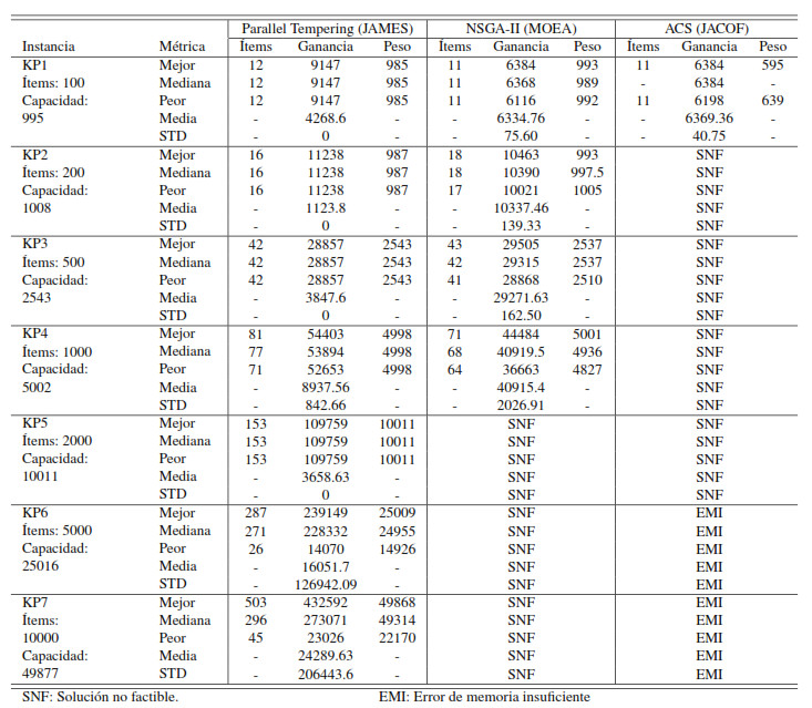 En los resultados experimentales de la Tabla 4 se observa que el algoritmo de Parallel Tempering de JAMES resuelve las 7 instancias del problema, a diferencia del NSGA-II de MOEA que resuelve únicamente 4 instancias del problema y el ACS de JACOF que solo resuelve la instancia KP1. Sin embargo, aunque JAMES obtuvo los mejores resultados al resolver todas las instancias del problema, MOEA tiene una mejor distribución de la media, es decir, no hay mucha desviación entre el mejor y el peor resultado. En otras palabras, JAMES en algunas ejecuciones no encontró una solución factible, mientras que MOEA en todas las ejecuciones logró encontrar una solución válida (en 4 instancias del problema).