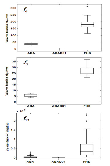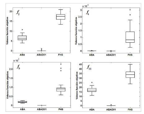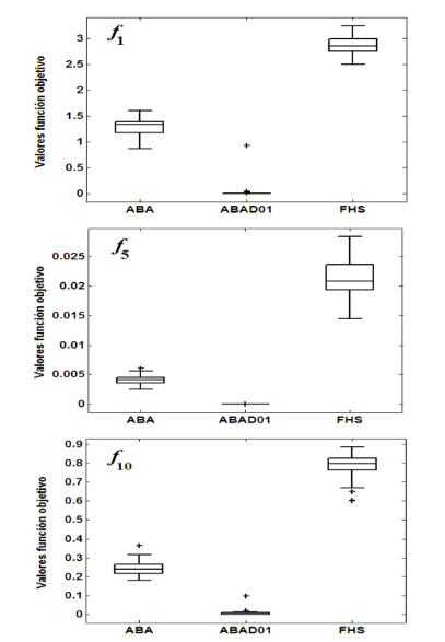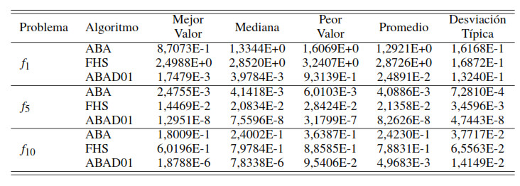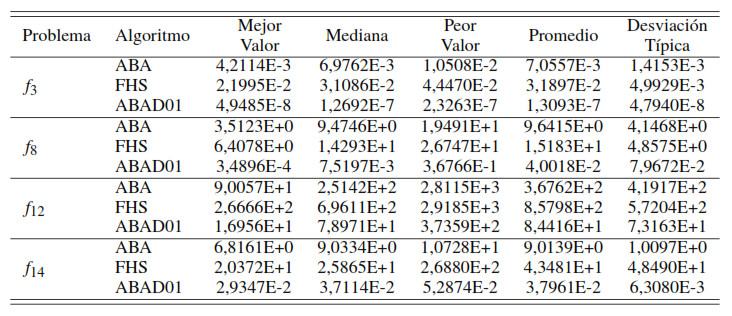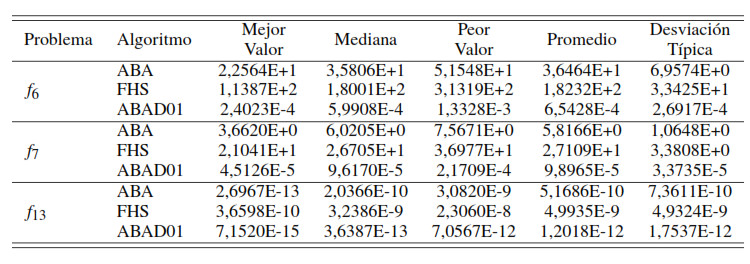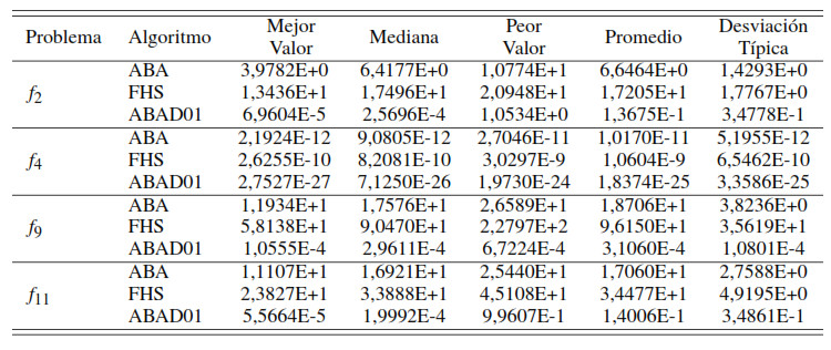 Para la resolución de los problemas de optimización no lineal se implementaron los algoritmos ABAD01, ABA [6] y FHS ( Fuzzy Harmony Search por sus siglas en inglés) [5]. Los valores asignados a los parámetros de estos algoritmos fueron consultados en [5, 17, 18] y se muestran en la Tabla 3.
