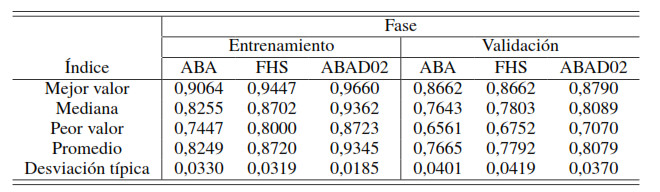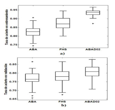 En la Figura 7, se presentan diagramas de caja y bigotes elaborados a partir del valor de la tasa de acierto, proporcionado por ABA, FHS y ABAD02 al término de sus ejecuciones, sobre los datos para entrenamiento (a) y validación (b) asociados al problema de clasificación tratado.