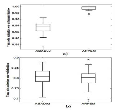Respecto a la comparación de la propuesta y el ARPEM, en la Figura 8 se muestra diagramas de caja y bigotes elaborados a partir del valor de la tasa de acierto, proporcionado por estos algoritmos al término de sus ejecuciones, sobre los datos de entrenamiento (a) y validación (b).