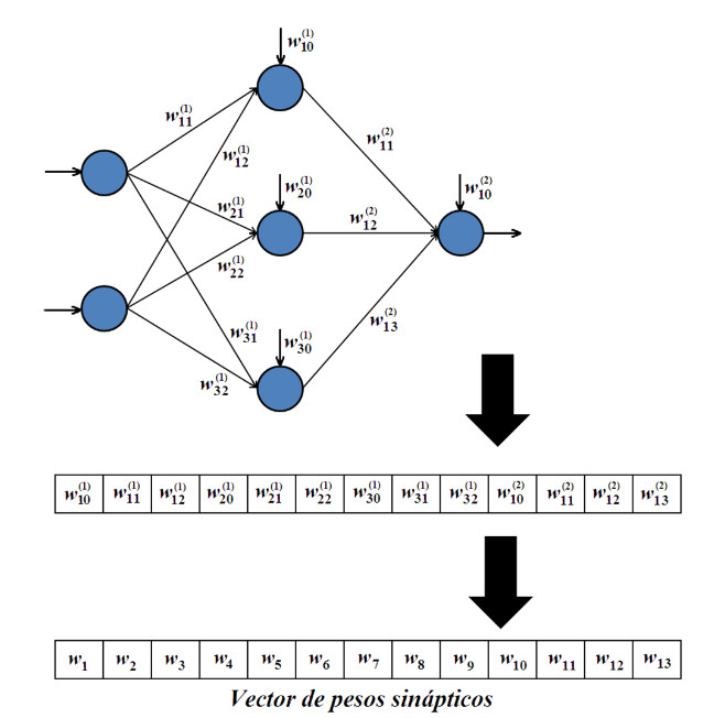 Para todos los problemas tratados, los datos se estructuraron mediante arreglos unidimensionales con esquema de codificación uno a uno de tipo punto flotante de doble precisión. Respecto al problema de clasificación, en la Figura 2 se muestra un ejemplo de la correspondencia entre pesos sinápticos y su representación para una red hipotética de dos (02) capas. Esta estructura se utilizó únicamente para los algoritmos meta – heurísticos.