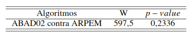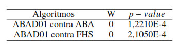 Se aplicó una prueba de Wilcoxon en base al índice promedio de las Tablas 9 a 12, tomando al ABAD01 como algoritmo de control [31]. Los valores se normalizaron entre 0 y 1 según el método Mín– Máx [28]. El nivel de significancia se fijó en 0,05. Los resultados se resumen en la Tabla 13.