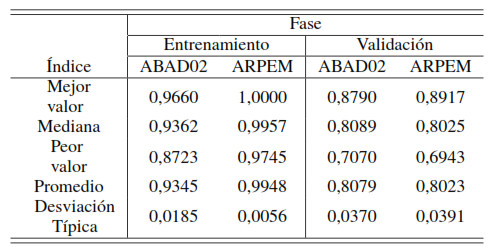 A partir de los datos mostrados en la Figura 7, se computaron los índices estadísticos: mejor valor, peor valor, mediana, promedio y desviación típica. Los resultados obtenidos se presentan en la Tabla 14.