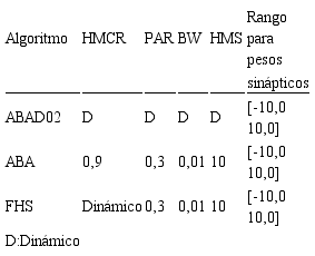 El universo del discurso de HMCR para FHS se estableció en [0,90 0,99]. Adicionalmente, se implementó el ARPEM [12] con tasa de aprendizaje igual a 0,008 y momento de 0,7. Estos valores se ajustaron empíricamente tratando de maximizar la velocidad de convergencia y eliminar oscilaciones en la curva de entrenamiento.