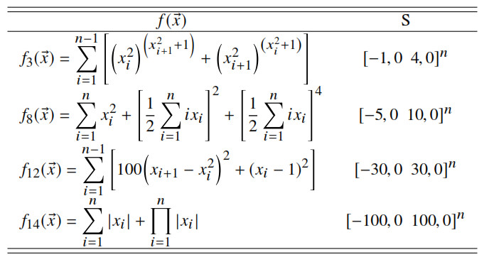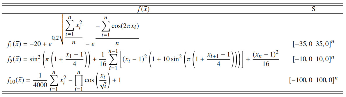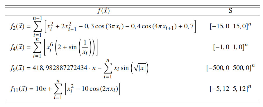 Se resolvieron problemas de optimización no lineal del tipo min sujeto a ∈ S ⊂ Rn, donde es la función objetivo, S representa el espacio de búsqueda y n el número de variables intervinientes. Los problemas tratados fueron consultados en [26], http://infinity77.net/global_optimization/index.html y http://www.sfu.ca/~surjano/optimization.html, siendo seleccionadas catorce instancias en atención a la modalidad y carácter separable de [26], tal y como se resume en las Tablas 5, 6, 7 y 8 mostradas a continuación.