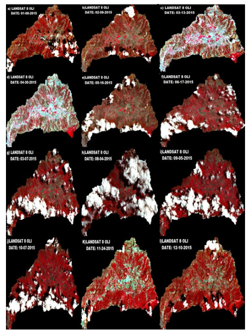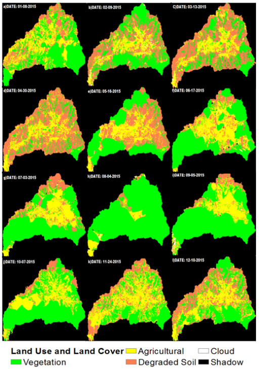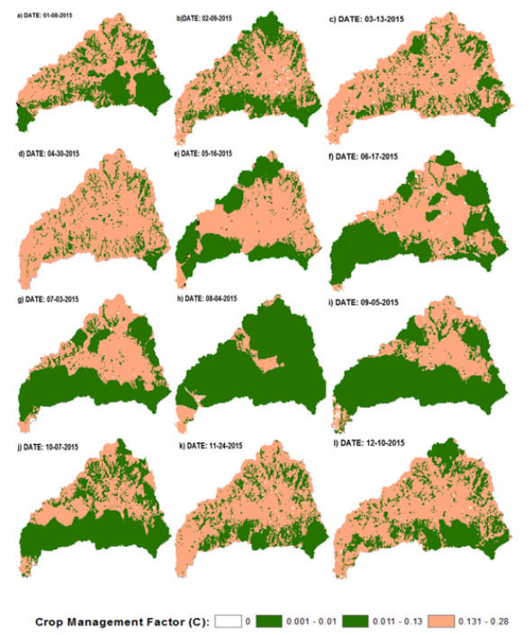 d) Results of crop management factor (C) the results of C factor require los results obtained on the land cover and land use derived from Landsat 8 OLI satellite images. These images are shown in Figure 7, where the Tucutunemo river basin is represented from January to December for 2015. The images are shown in false color using the combination of the spectral bands: 5, 4 and 3. The red color is representing the vegetation coverage, which is the most part of the area. Toward the central region of the basin in brightness tone is observed the agricultural uses, which represents the main activity in the Tucutunemo river basin. The classified images are shown in Figure 8, where the land use a land cover (LULC) detected are five, the percent spatial distributions of LULC and C factor for April 2015 are the following (Figure 8d): 1) vegetation (18,92 km², 16 %, 0,01), 2) agricultural (30,08 km², 25 %, 0,13), 3) degraded soil (69,95 km², 59 %, 0,28), 4) clouds (0 km²) and 5) shadows (0 km²). The percent spatial distribution for August 2015 is the following (Figure 8h): 1) vegetation (106,93 km², 90,3 %, 0,01), 2) agricultural (8,18 km², 6,9 %. 0,13), 3) degraded soil (3,3 km², 2,78 %, 0,28), 4) clouds (0 km²) and 5) shadows (0 km²).