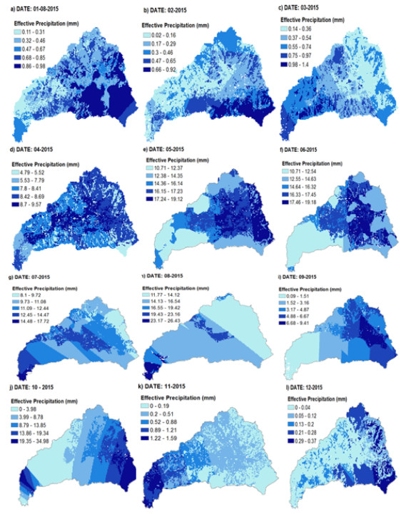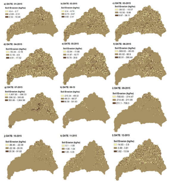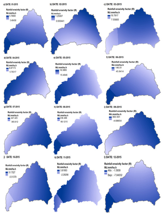 The coefficient d represents the parameter of the J-Bessel function. There is pattern in the SPPMs for the dry season, associated with the first months of the each year. In all cases, the semivariances are smaller at shorter distance and then they stabilize at some distance. The results for the rainfall erosivity factor (R) from January to December 2015 are shown in Figure 3. The rainfall erosivity factor in the dry months varies between 0,93 and 19,79 MJ.mm/ha.h (Figures 3a, 3b, 3c, 3k and 3l). The R factor varies between 15,46 and 447,43 MJ·mm/ha·h in the rainy months (Figures 3d-3h). During the dry season, the precipitation of 30 minutes and R factor are higher in the middle and low regions of Tucutunemo basin.