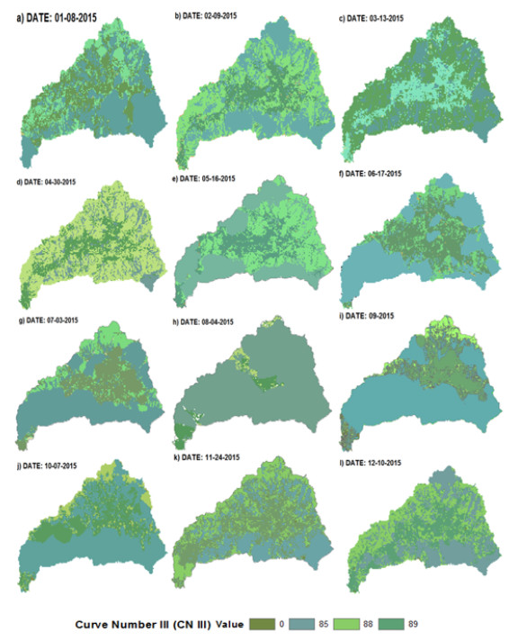 The results of monthly sediment yield maps during 2015 are obtained using equation (12). The results for the two factors involved in equation (12) are described for each one of these: a) Curve number (CN); and b) effective precipitation (Pe). The curve number used corresponds to the soil wet condition. The curve number varies between 85 and 89. This range of CN is small because the Tucutunemo river basin is of rural type. The curve number of 85 is associated to a good cover forest combined with a soil type with moderately high runoff potential. This curve number has the greatest occurrence because of the vegetation comprises the most part of terrain coverage in the Tucutunemo river basin, b) the effective precipitation (Pe) is influenced by the dry and rainy seasons occurred for 2015. The higher effective precipitation varies in the range between 19 y 34 mm for October 2015, which is located between the north and middle regions of the Tucutunemo river basin. During the dry season, the effective precipitation varies between 0 and 1,59 mm. During the rainy season, the effective precipitation varies between 9,57 and 34 mm. In whole year 2015, the effective precipitation is higher during the rainy season by comparing to the dry season, occurring in the agricultural plots and in the mountainous area, c) the sediment yield (SY) is influenced by the dry and rainy seasons occurred for 2015. The higher sediment yield varies in the range between 41710 and 81192 g/ha for October 2015, which is located between the north and middle regions of the Tucutunemo river basin. During the dry season, the sediment yield varies between 0 and 60,25 g/ha. During the rainy season, the sediment yield varies between 20055 and 81192 g/ha. In whole year 2015, the sediment yield is higher during the rainy season by comparing to the dry season, occurring in the agricultural plots and in the mountainous area.