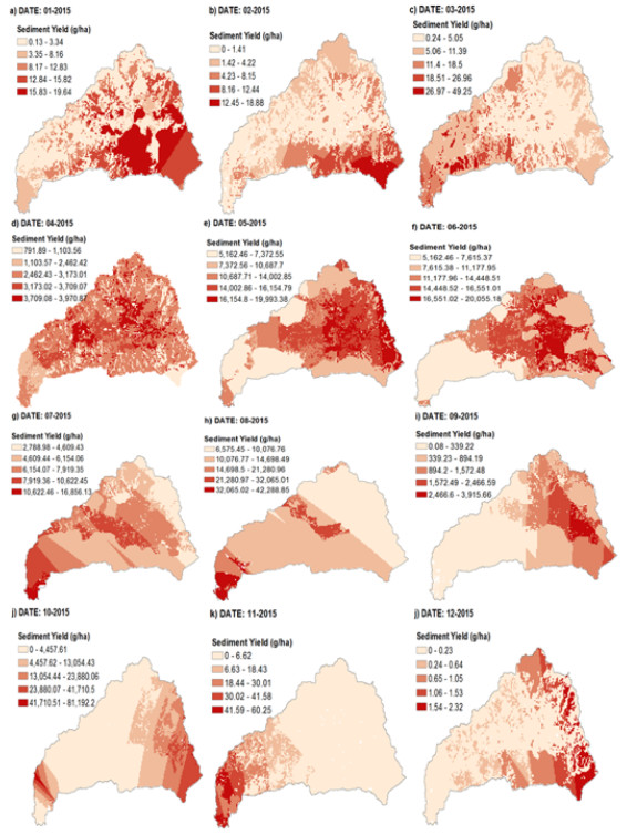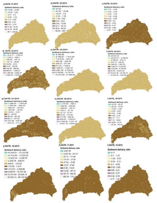 The results of sediment delivery ratio (SDR) are shown in Figure 15. The sediment delivery ratio varies according to the dry or rainy season. In general, SDR varies between 0 and 1 in whole of year. However, SDR takes punctual values > 1 indicating accumulation areas of sediment. During the rainy season, it would be necessary to expand the number of classes to a number greater than ten to show the specific areas of sediment accumulation (Figures 15d-f).