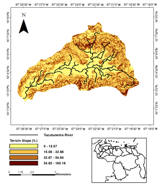 The study area is the Tucutunemo river basin located in the Aragua State at the central region of Venezuela (Figure 1). The basin area is limited by the following coordinates: 67°19’00”W, 67°29’00”W, 10°02’00”N, 10°08’30”. The length of the main stream of the Tuctunemo river is of 27 km. The terrain slope varies as follows: 0-15 % (41 km², 37 %), 15-33 % (38 km², 35 %), 33-54 % (25 km², 22 %), 54->153 % (7km², 6 %). Most part of terrain slope can be classified as of mean to high varying in a range between 5 and 20 % [10]. The total area of basin is 110 km².
