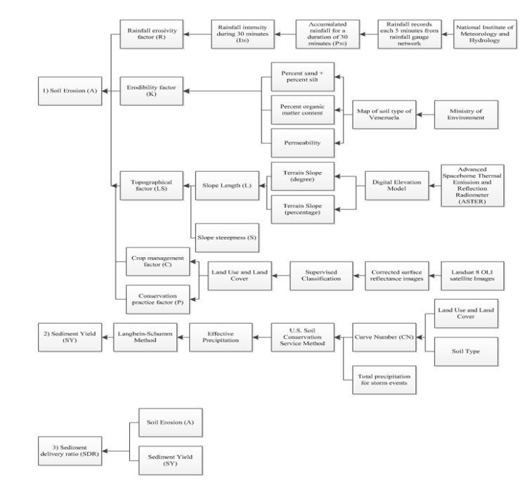 The soil erosion is estimated using the Universal Soil Loss Equation (USLE) model developed by [1] following the process shown in the Figure 2. The equation (1) estimates A, the average annual soil erosion per unit area (t/ha) from six independent factors: a) R is rainfall erosivity factor (MJ.mm/ ha.h); b) K is the soil erodibility factor (Mg∙h/MJ∙mm) c) LS is the topographical factor integrated by L, length factor and S, the slope steepness factor; d) C is the crop management factor and e) P is the conservation practice factor.