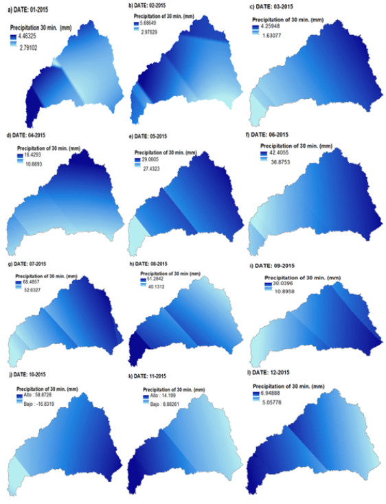a) Results of rainfall erosivity factor (R) (Figure 3), the main variable to estimate the rainfall erosivity factor is the precipitation of 30 minutes. The results for the precipitation of 30 minutes from January to December 2015 are shown in Figure 4. The precipitation of 30 minutes in the dry months is similar varying between 1,63 mm and 14,19 mm (Figures 4a, 4b, 4c, 4k and 4l). The precipitation of 30 minutes varies between 10,67 and 68 mm in the rainy months (Figures 4d-4h). The statistical spatial prediction model (SSPM) of monthly precipitation is the J-Bessel function. This function is fitted to the observed precipitation with a gradient that varies between 0,4 and 0,75 (Table 5). The equation is identified by the following coefficients in a general structure: a·Nugget+b·(J-Bessel(c, d)). The values of coefficients vary as follows (Table 5): a: between 0 and 119,36, b: between 14,152 and 492,47, c: between 31797 and 558150, d: between 0,01 and 1,9944. The coefficient a is associated with the no spatial correlation. The coefficient b is associated with C0+ C1 term, which is the sill variation. The coefficient c represents the maximum distance between stations of neighbor precipitation observations.