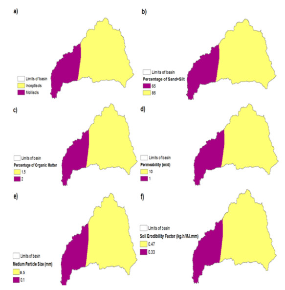 b) Results of erodibility factor (K) the erodibility factor is estimated by physical parameters which are indicated in the Figure 5. The soil type consists of two classes (Figure 5a): inceptisols and mollisols.