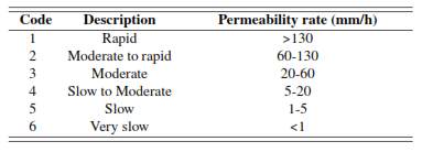 Where, K: soil erodibility factor (Mg.h/MJ.mm); M: particle size parameter (percent silt + percent very fine sand); a: percent organic matter content; b: soil structure code; c: soil profile permeability class. The parameters for the K factor estimating are derived from the Venezuela soil national map created by the Ministry of Environment and available from the website of the Geographic Institute of Venezuela, Simon Bolivar. The extraction of soil type for the Tucutunemo river basin is made using the tool of extraction by mask in ArcGIS 10.0 (Figure 5). Two soil types are found in the Tucutunemo river basin, which are inceptisols (87,75 km², 74 %) and mollisols (31,2 km², 26 %) (Figure 5a). Once the soil type is defined, the a and b parameters are mainly obtained from [15]. The average of organic carbon amount in the different depths of profiles in inceptisols order is found varying between 1,1 and 1,44 % for a soil depth from 0 to 15 cm [16]. The particle size distribution of inceptisols soil for a depth from 0 to 24 cm determined by Voncir et al.[17], is: sand: 70,45 %, silt: 15,06 %, clay: 14,49 %.The average organic matter amount and average texture for a mollisols soil type are determined by [17, 18], as follows: organic matter: 26 g/kg (2,71 %), sand: 120 g/kg (12,5 %), silt: 577 g/kg (60,16 %), clay: 236 g/kg (24,6 %). The percent sand + silt contents and percent organic matter content are shown in Figures 5(b) and Figure 5(c), respectively. For inceptisols and mollisols soils according to the particle size distribution, the permeabilities are 10 m/d and 1 m/d, the medium particle sizes are 0,5 and 0,1 mm, respectively [19]. These parameters a and b to determine the K factor in equation (8) are selected from Table 2 and Table 3. The result of erodibility factor is shown in the Figure 5f.