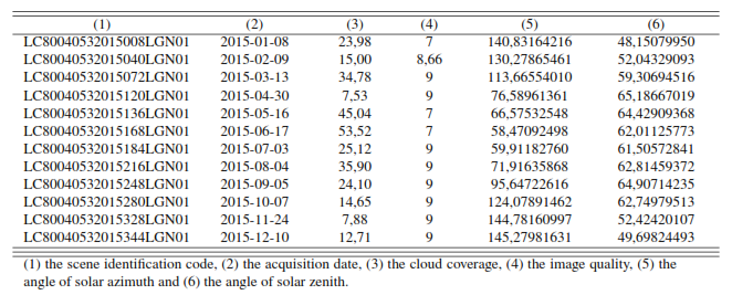 The dependence of the cloud free images restricts the sampling opportunities to the dry season in the tropics [21]. Images affected by clouds, aerosols and haze often contain a large number of free pixels that can be used. The image represents the LULC condition during the dry and rainy season. In Venezuela, the dry period begins in November or December and ends in April or May while the rainy season begins in April or May and ends in November or December [22]. The image characteristics acquired according to the satellite are identified as follows (Table 4): a) the scene identification code: LC80040532015008LGN01, b) the acquisition date: 2015-01-08, c) the cloud coverage:23,98, d) the image quality: 9, e) the angle of sun azimuth: 140,83164216 and f) the angle of sun elevation: 48,15079950. The parameters of map projection according to the United State Geological Survey (USGS) are: a) Projection: Universal Transverse Mercator (UTM), b) Datum: World Geodetic System 1984 (WGS84), c) UTM Zone: 19 N and e) Resample Method: Cubic Convolution.