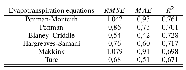 Many studies have confirmed the Penman-Monteith method as the most appropriate method in comparison with the lysimetric method. Namdarian et al. [15] compared of the FAO Penman-Monteith method and class A evaporation pan with lysimeter data in estimating evapotranspiration (Cicer arietinum L.) in Khorramabad. The aim of this research was to determine the crop coefficients of chickpea in a research field in Lorestan agriculture faculty in 2013 to find (Cicer arietinum L.) water requirement and different crop coefficients. For that, 4 drainable lysimeter was selected in which diameter and height were 0,45 and 0,8 m, respectively. The crop density was 50 plant per m2. The water requirement of chickpea was estimated equal to 438mm. The potential evapotranspiration also was estimated equal to 554, 2mm. More ever, the best pan coefficient also was determined by comparing with lysimetric results. Different parameters such as RESE, MBE, MAE and R2 were used to determine chickpea evapotranspiration. Finally, the results showed that the FAO model with error RMSE 0,174 is an optimum model for this region and Snyder method was modified in the second accurately. The FAO Penman Monteith method for calculating reference evapotranspiration in the region of 4,8 % less than the amount of the lysimeters. Raoof and Azizi Mobaser [16] evaluated of eighteen reference evapotranspiration models under the Ardabil climate condition. This study was conducted in Hangar research station of the University of Mohagheghe Ardabili, Ardabil. For this purpose, grass was planted in 3 lysimeters and around the lysimeters. Grass evapotranspiration measured by volumetric lysimeters based on water balance equation components (input and output water volume, save moisture and evapotranspiration), was estimated. To estimate reference evapotranspiration 18 models, including models such as temperature, radiation, and the combination was chosen. The meteorological synoptic station of Ardabil was used to prepare the information needed to model. Besides the results of lysimeters, evapotranspiration obtained by the FAO Penman-Monteith model also was used as a reference for comparing the performance model. Evapotranspiration estimation models using statistical indices, root mean square error (RMSE), mean absolute error (MAE), the estimated margin of error (PE), the ratio (MR) and spearman’s rho coefficient is calculated as follows to cross they were evaluated. The results showed that for all models, high dispersion of points around the line one to one, or answer them consistent with the results of lysimeters answer is not good. Moreover, some of these models overestimated and underestimated some of them to calculate evapotranspiration. Using statistical indicators may be compared with the results of lysimeters, at the most proper research models, respectively Blaney–Criddle, Ravazzani and the Rn and the weakest models respectively Irmak and Valiantzas. Overall fit the model results against the results of the FAO Penman-Monteith model compared to its results compared to the results of lysimeters, was more suitable. Also according to the statistical criteria in this study, the FAO Penman-Monteith model, the most appropriate models were Turk, Berti and the Trajkovic, and the weakest models, modified Hargreaves-Samani, Irmak and Scandal were determined. Conclusion of this research conformity with the results of many research studies. Many studies have confirmed the Blaney–Criddle method as the most appropriate method in comparison with the lysimetric method. Piri [17] evaluated of different methods potential evapotranspiration in Sistan plain. In this study compares the evapotranspiration calculated by the Blaney–Criddle, Jensen Hayes, reform Jensen Hayes and Hargreaves-Samani to FAO Penman-Monteith method and lysimeter in Sistan plain than the way has been identified to be most correlated with the FAO Penman-Monteith. The results shown that Blaney–Criddle has maximum correlation coefficient (0,973 and 0,971) and Hargreaves- Samani method has minimum correlation coefficient (0,75 and 0,69) than other methods of calculating evapotranspiration. Ebrahimipak and Ghalebi [18] determined of evapotranspiration and crop coefficient (kc) of sugar beet using lysimeter and compared it with experimental methods in Shahrekord. This study aimed at determining the evapotranspiration and crop coefficient (Kc) of sugar beet during the plant growth using drainage lysimeter by using water balance and experimental methods for three years in Shahrekord. After sugar beet planting and out of lysimeter, evapotranspiration was measured weekly and monthly by measuring the factors of the water- balance equation. Results showed that the total evapotranspiration of sugar beet was 1016,6 mm during the growing season and the rate of water drainage and the soil moisture content were 73,9 and 66,1 mm, respectively. The amount of evaporation from class A pan was 1364,5 mm. Evapotranspiration of the reference plant was measured by using drainage lysimeter and estimated by using the experimental methods. Results showed that the evapotranspiration rate of the reference plant was 1123,03 mm and among the experimental methods, the Blaney- Criddle FAO24 and Penman-Monteith FAO 56 method had more accuracy. Crop coefficient at early stage, development stage, middle stage, and final stage was 0,72; 0,81; 1,04; and 0,7 with an average of 0,89 for the whole growing period of sugar beet. The average pan evaporation coefficient (Kp) was 0,83; and the average water requirement coefficient (Kc.p) was 0,73 for the growing season of sugar beet. so the Blaney–Criddle method is the most suitable method for estimating the evapotranspiration of the rice plant in Sari region.