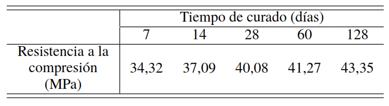 Sin embargo, a partir de los 28 días la resistencia comenzó a elevarse observándose una tendencia similar a la mezcla patrón tal como se observa en la Tabla 2 a los 128 días de curado. Cabe considerar, por otra parte, que los valores de resistencia a compresión obtenidos cumplen con los valores estándares o comerciales para concretos de moderadas resistencias según lo expresado por Porrero et al. [17] los cuales se encuentran en un rango de 21 y 30 MPa para un tiempo de curado de 28 días.