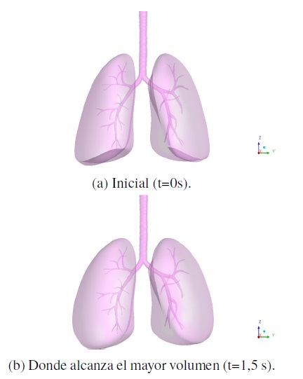 Es importante acotar que la modelación de la tráquea, bronquios, segmentaciones bronquiales y el pulmón representan el dominio fluidizado, o campo de flujo, es decir, la geometría que describe el volumen ocupado por el fluido en el interior de los mismos. Por otra parte, también se modeló el tejido de los pulmones como un sólido, ya que al mismo se le aplica un análisis dinámico transitorio con el módulo de Ansys “Estructural Transitorio” (Structural Trasient), en donde se evalúa su respuesta dinámica.