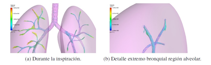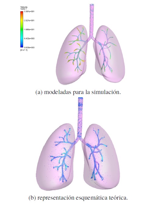 La dinámica de fluidos computacional (CFD), ha permitido un análisis detallado del flujo en las geometrías más complejas. Este último ha elucidado importantes características del flujo de aire, como perfiles de velocidad, patrones de velocidad secundarios, caída de presión, relaciones de división del flujo y turbulencias características en la red de ramificación. Además, ha sido recientemente aplicado para simular los flujos de las vías respiratorias de los pulmones humanos, desde modelos de pulmón simplificados e idealizados a imágenes realistas basadas en geometrías asimétricas específicas del paciente, incluidas las vías respiratorias inferiores.