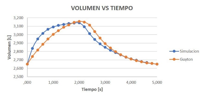 En la Figura 11 se observa la comparación de la gráfica teórica Volumen vs Tiempo obtenida a través de la simulación y la gráfica experimental presentada en [11].