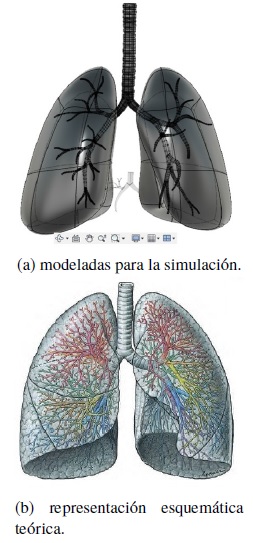 Se presentó un modelado 3D para ser usado en la simulación, tomando como referencia las dimensiones del sistema respiratorio recopiladas a través de libros de anatomía médica, tomografías pulmonares computacionales, imágenes reales y asesoramiento de profesionales en el área, cumpliendo con las especificaciones dimensionales de la tráquea, longitudes y diámetros de algunos bronquios, espesor del tejido pulmonar, volúmenes de los pulmones, y distribución de los bronquios descritas de manera teórica de una persona promedio o “estándar”.