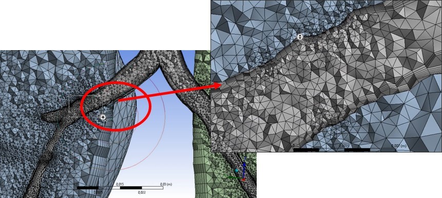 Por otra parte, se empleó una herramienta de mallado denominada “Inflación” (inflation), como se muestra en la Figura 2. La aplicación de esta herramienta permite capturar la física del flujo cerca de las paredes mientras se realizan los cálculos de CFD, además, otorga mayor precisión en los cálculos por permitir la mejor resolución del comportamiento de la capa limite en los flujos delimitados por la pared.