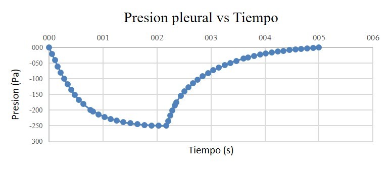 Con respecto a las configuraciones que definen el comportamiento físico de los pulmones, se tiene primeramente la carga de presión. Los valores de la presión pleural aplicados al modelo, se obtuvieron a través de la parametrización de la gráfica Presión pleural vs Tiempo extraída de Guyton [11], que se observa en la Figura 3.