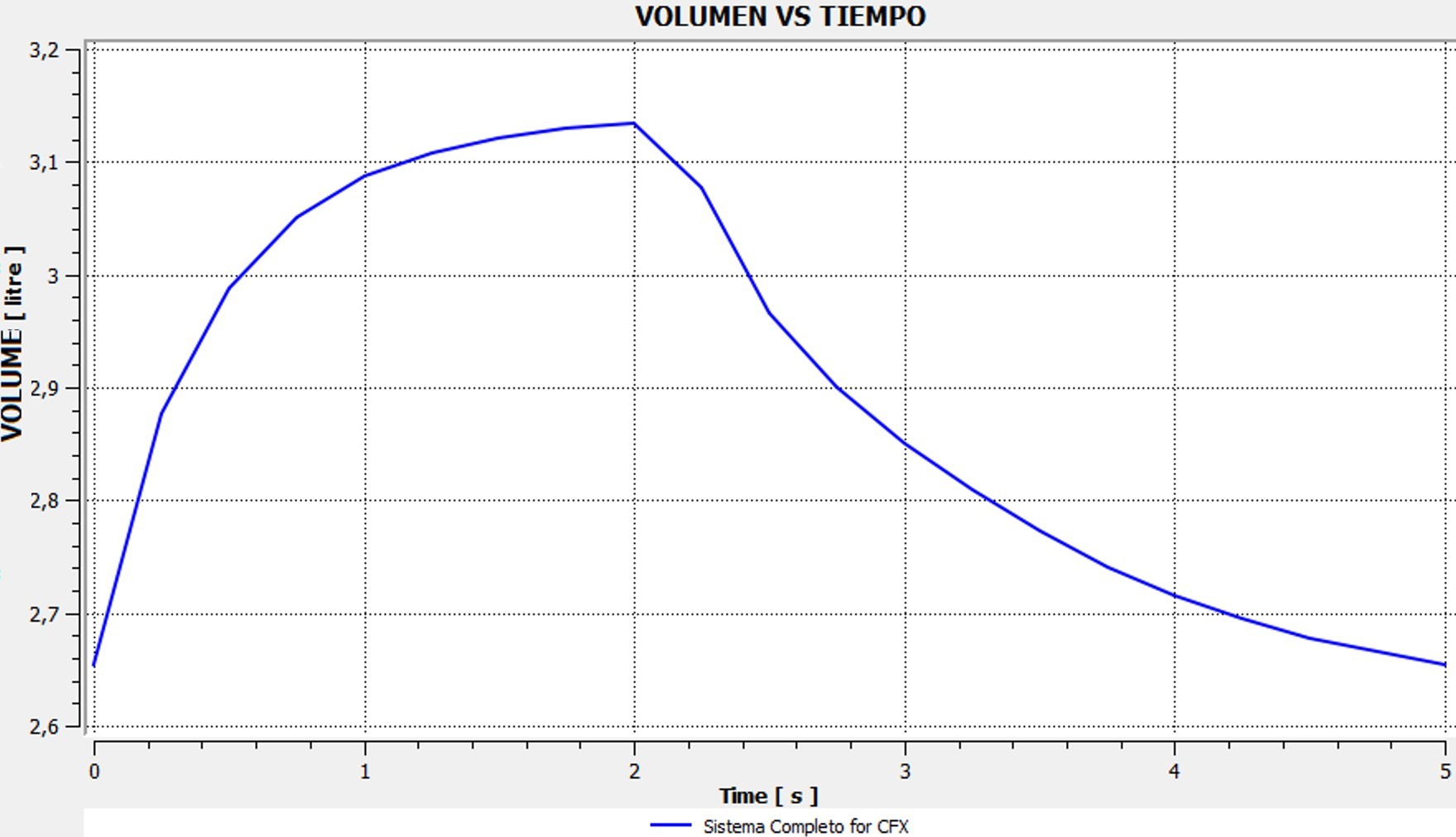 Una vez terminado el proceso iterativo se examinaron los valores de las variables de salida arrojados por el paquete de software a partir de la malla y condiciones de borde empleadas. Se crearon las gráficas teóricas que se comparan para validar los resultados a través del CFX-POST. Luego, se plantea la realización de la gráfica teórica Volumen vs Tiempo, como se aprecia en la Figura 4.