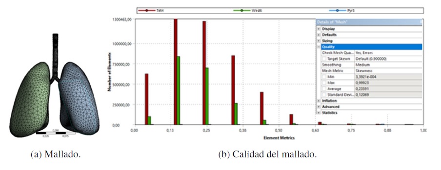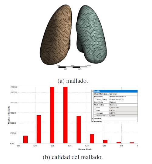 Para confirmar la calidad del mallado del tejido pulmonar, según la Figura 5, se observa el promedio de asimetría de los tetraedros generados, el cual fue de 0,30719, cuyo valor es considerado como una malla de muy buena calidad [14].