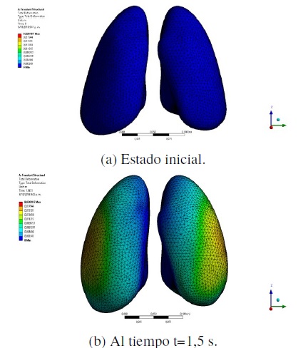 En la Figura 7 se muestra el resultado de la deformación del tejido pulmonar simulado en el módulo “Estructural Transitorio”, en la cual se aprecia la máxima deformación alcanzada, que posee un valor de aproximado de unos 20 mm, y ocurre en la zona inferior de los pulmones donde está en contacto con el diafragma.