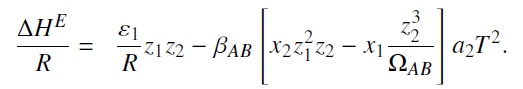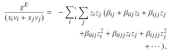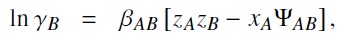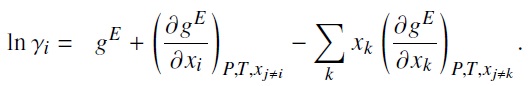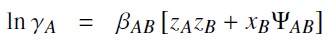 En la ecuación (1), gE viene definida como ∆GE /RT , donde ∆GE es la energía libre en exceso de Gibbs, zi es la fracción del tamaño efectivo νi , los términos βi, βi j , βi j j , etc, son parámetros ajustables. Realizando ciertas modificaciones en la definición de zi es posible obtener expresiones simples para el coeficiente de actividad [8] tales como: las ecuaciones de Margules, Van Laar, Scatchard-Hamer, etc.