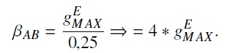 En cuanto al modelo SIMÉTRICO, este es muy versátil, pues permite varias formas de parametrización, incluyendo la anteriormente descrita. Sin embargo, en este trabajo mostraremos dos procedimientos más expeditos de parametrizarlo, basados en el comportamiento de gEcon la composición y que está más de acuerdo con el procedimiento sugerido por Abbott, et al [31]. El primer método, puede verse como una aproximación gruesa, ya que depende mucho de errores de lectura o de interpolación. Y se realiza con una simple inspección gráfica del comportamiento funcional de gE , con la composición del componente B (xB). En ella es posible estimar un punto máximo de energía libre en exceso gEMAX. Posteriormente, se puede utilizar la relación geométrica que existe entre este punto máximo, gEMAX , y la pendiente de la recta ( βAB ), según la ecuación (13)