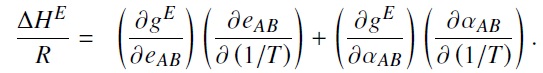 Adicionalmente, la entalpía en exceso también se puede estimar usando para ello la dependencia funcional que tienen sus parámetros con la temperatura, y el exceso de energía libre de Gibbs según la ecuación (17).