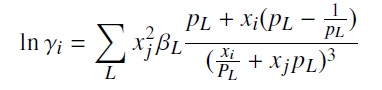 En la ecuación (3), zi,Les similar a la definida en la ecuación (2), solo que para cada L–término introduce una relación (ν jνi)L (= p2L) diferente, es decir, que para cada L–término se requiere dos juegos de parámetros βLy pL . Esta alternativa permite simplificar la expresión (ecuación (4)) para los coeficientes de actividad γi , pero no elimina la necesidad de un número apreciable de parámetros. Además, se pierde información con respecto al tamaño efectivo molecular.